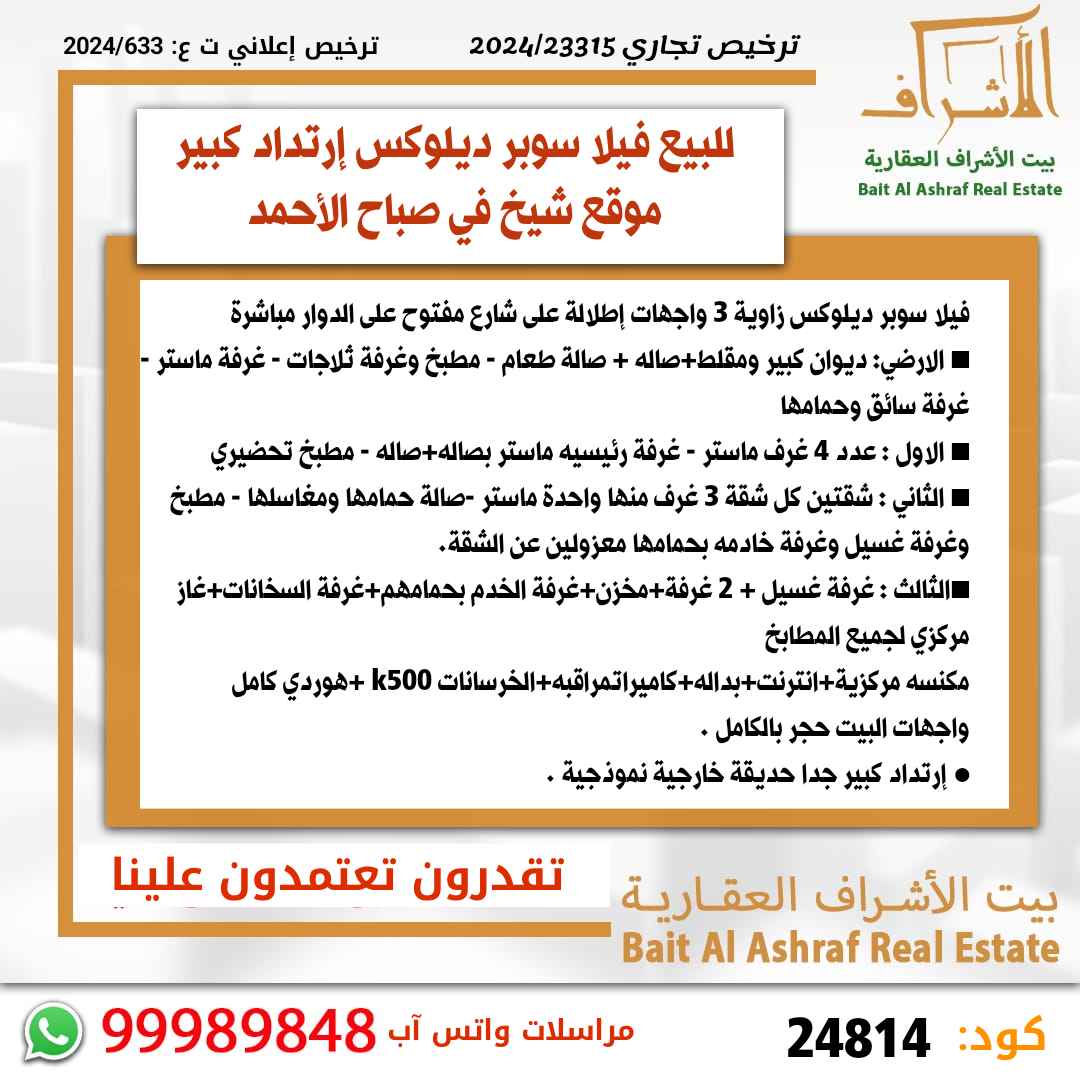 فيلا 600م سوبر ديلوكس زاوية 3 واجهات إطلالة على شارع مفتوح على الدوار مباشرة